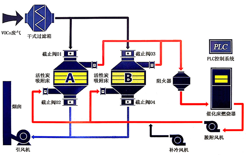 活性炭吸附+催化燃燒脫附裝置,是采用催化燃燒活性炭脫附,將大風(fēng)量低濃度的有機(jī)溶劑吸附到活性炭中,經(jīng)催化燃燒將含溶劑活性炭加熱到沸點(diǎn),通過(guò)催化劑的氧化燃燒反應(yīng),將炭中物質(zhì)轉(zhuǎn)化為無(wú)害的水和二氧化碳排入大氣,并且能解決活性炭脫附的二次污染。如果VOCs廢氣濃度低于1000g/m,出口溫度低于45℃,其性質(zhì)屬于低濃度廢氣,因此選擇活性炭吸附-催化燃燒脫附較為理想。
